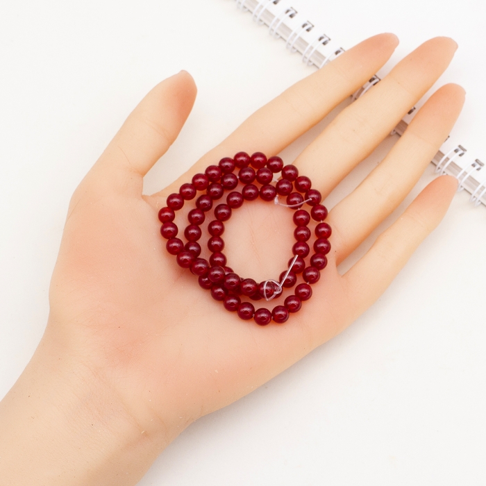 Okrągłe koraliki z naturalnego karneolu, barwione na intensywny czerwono-pomarańczowy odcień. Kamień ma ciepłą, promienną barwę i gładką powierzchnię, co dodaje biżuterii wyrazistości i energii. Karneol symbolizuje witalność, odwagę i inspirację.