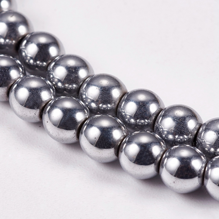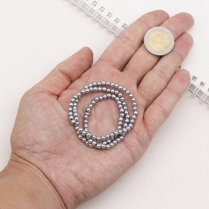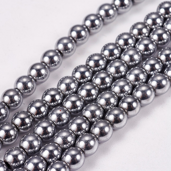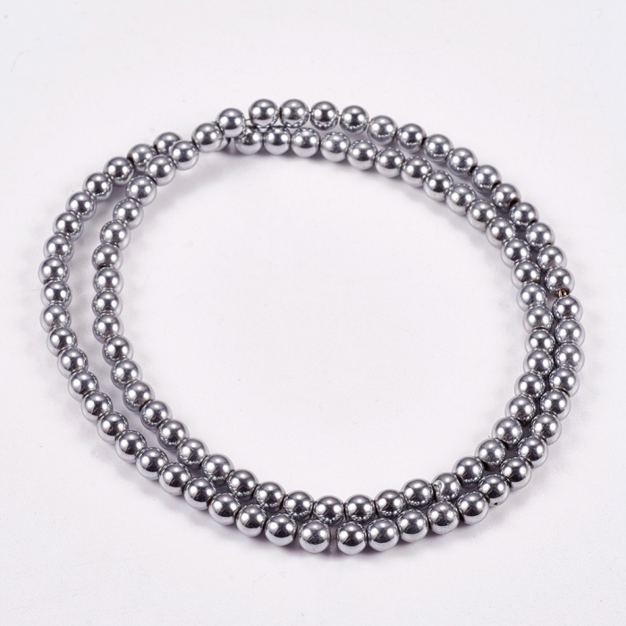 Koraliki Hematyt Syntetyczny Niemagnetyczny, Galwanika, Klasa A, Okrągły, Pokrycie Platyna, Kraj pochodzenia kamienia to Chiny. Rozmiar: Średnica: 4mm, otwór 1mm około 95szt / 38cm / nić Syntetyczne niemagnetyczne koraliki hematytowe to stylowe i wyrafinowane koraliki stworzone z hematytu wytworzonego przez człowieka. Koraliki te mają metaliczny połysk i unikalny mieniący się odcień, co czyni je bardzo atrakcyjnymi do tworzenia różnorodnej biżuterii. Są one powszechnie używane do tworzenia bransoletek, naszyjników, kolczyków i innych modnych akcesoriów. Niemagnetyczny hematyt jest również związany z różnymi właściwościami energetycznymi, takimi jak hart ducha, siła i ochrona. Jeśli nosisz niemagnetyczne koraliki hematytowe, możesz czuć się bardziej skoncentrowany i zrównoważony. Biżuteria z hematytu jest znana ze swojej wszechstronności i atrakcyjności, co czyni ją doskonałym wyborem dla osób poszukujących nowoczesnych i stylowych opcji, które mogą dodać blasku i elegancji każdej stylizacji.