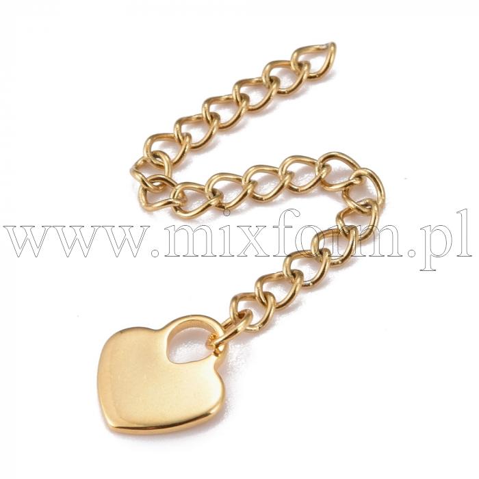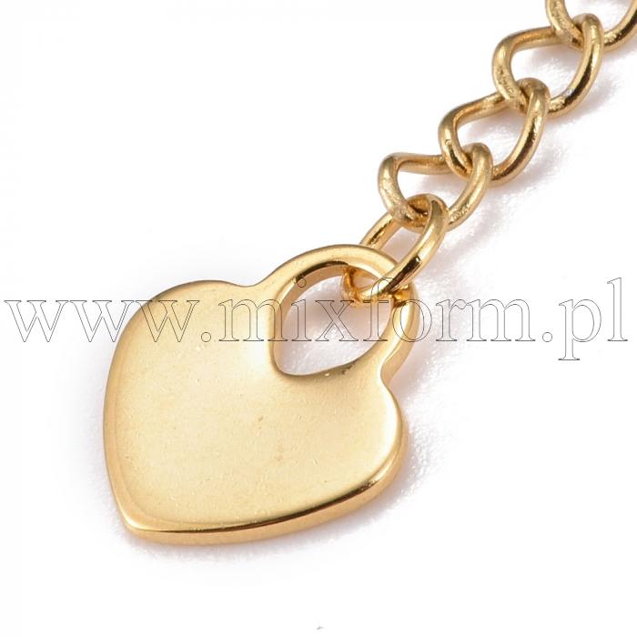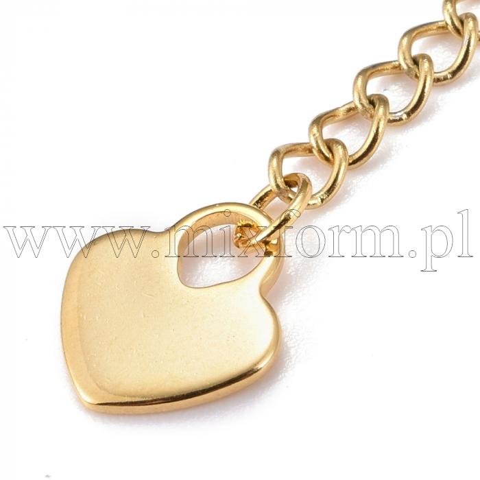 Złoty łańcuch przedłużający ze stali nierdzewnej z eleganckim wisiorkiem w kształcie serca. Doskonały do wydłużania naszyjników lub bransoletek, nadaje biżuterii subtelny i spersonalizowany akcent.