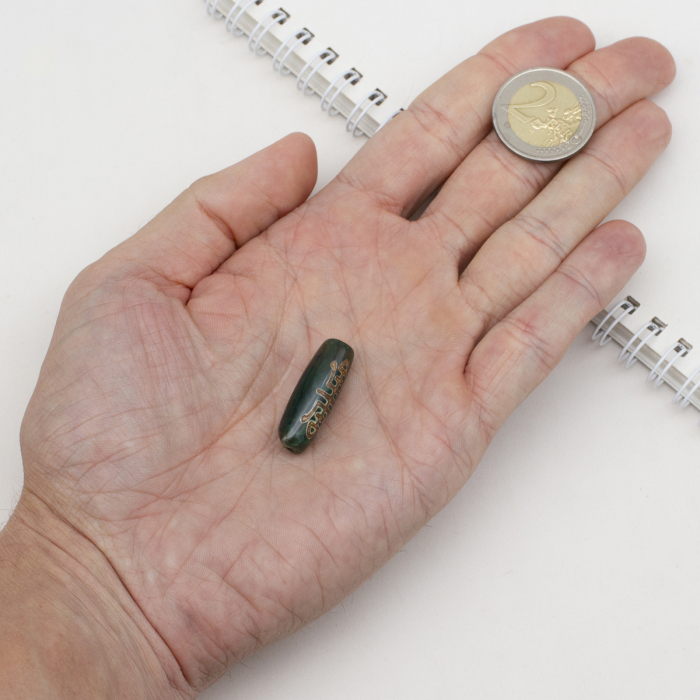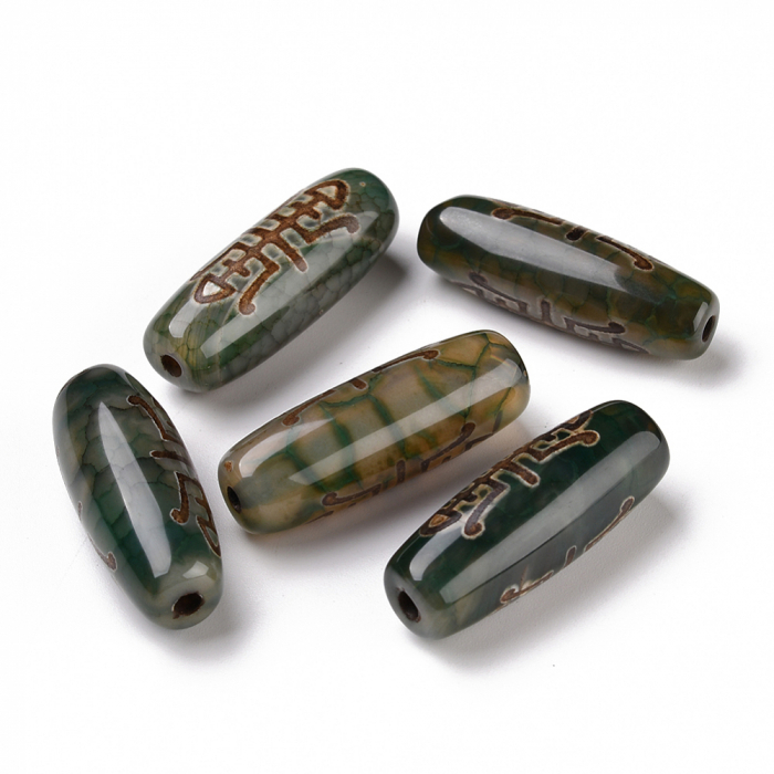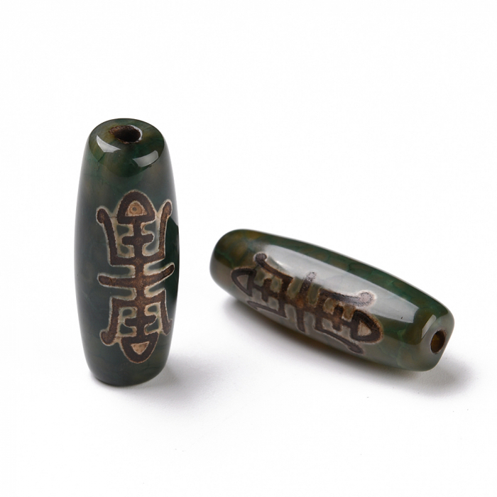 Koraliki wykonane są z naturalnego agatu i stylizowane są na tradycyjny tybetański dZi. Dzięki tonowaniu i wygrzewaniu na powierzchni powstaje wyraźny ornament „Podwójna Długowieczność”, symbolizujący zdrowie, długie życie i duchową ochronę. Owalny kształt sprawia, że koraliki są wygodne w użyciu w biżuterii, nadając produktom harmonię i etniczny charakter.