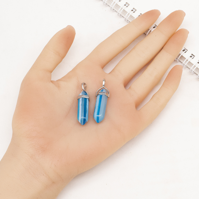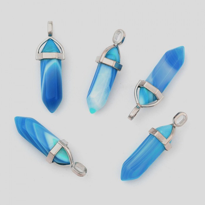 Ten naturalny agatowy wisiorek z podwójnym stożkiem i aluminiową skuwką to stylowy i elegancki dodatek do tworzenia biżuterii. Żywy odcień agatu i stożkowy krój nadają wisiorkowi wyrafinowany wygląd, a metalowa nasadka stanowi dekoracyjny akcent i zapewnia łatwy montaż wisiorka. Każdy wisiorek jest wyjątkowy ze względu na naturalną fakturę agatu.