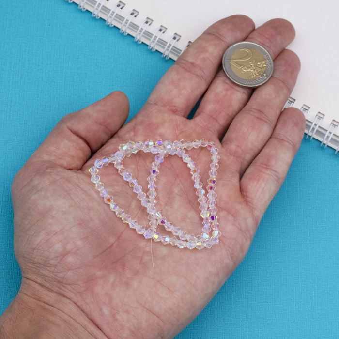 Koraliki szklane imitujące austriackie kryształy klasy AA to wysokiej jakości elementy dekoracyjne służące do tworzenia stylowych i eleganckich produktów. Ich fasetowana powierzchnia i dwustożkowy kształt zapewniają olśniewający połysk i wdzięczne załamanie światła, a opalizująca powłoka AB (Aurora Borealis) dodaje efektu mieniącego się wszystkimi kolorami tęczy, a jakość AA gwarantuje ich trwałość i piękno. Koraliki te wykonane są z najwyższej jakości szkła, dzięki czemu są trwałe i estetyczne.