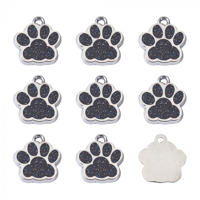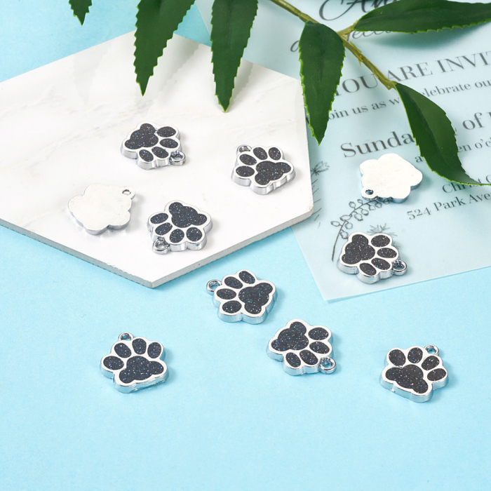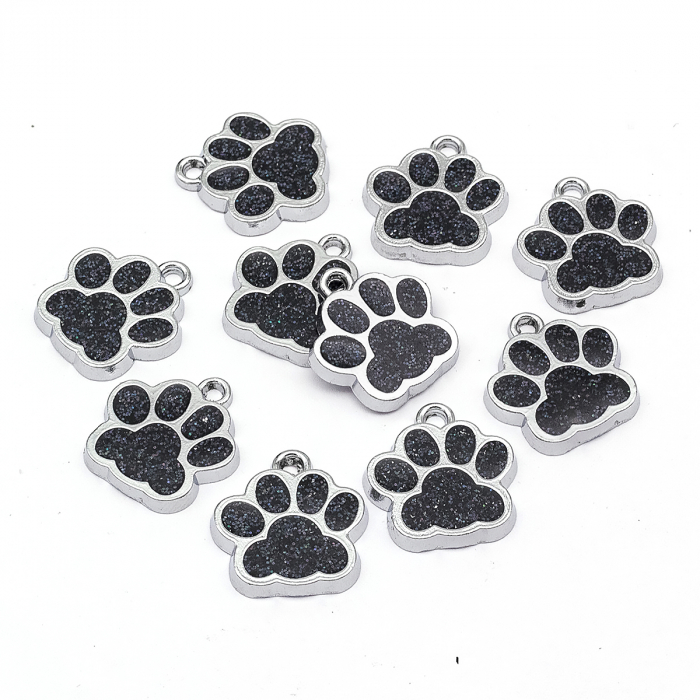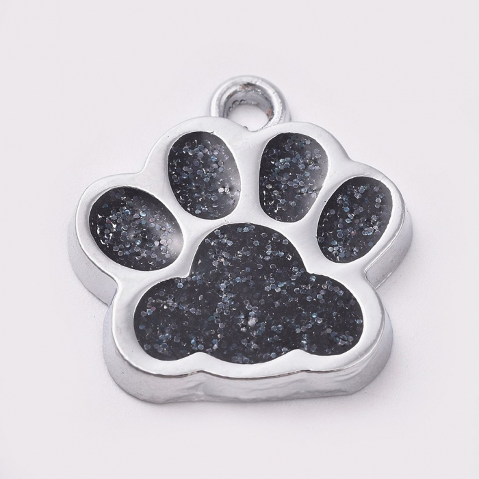 Zawieszki z łapkami wykonane ze stopu jubilerskiego z dodatkiem emalii i proszku brokatowego stanowią oryginalny i dekoracyjny element tworzenia biżuterii. Wykonane z wysokiej jakości stopu jubilerskiego z powłoką w kolorze platyny, są trwałe i odporne na matowienie. Czarna emalia z dodatkiem brokatu nadaje wisiorkowi połysk i głębię, dodając produktom stylowego i wyrazistego akcentu.