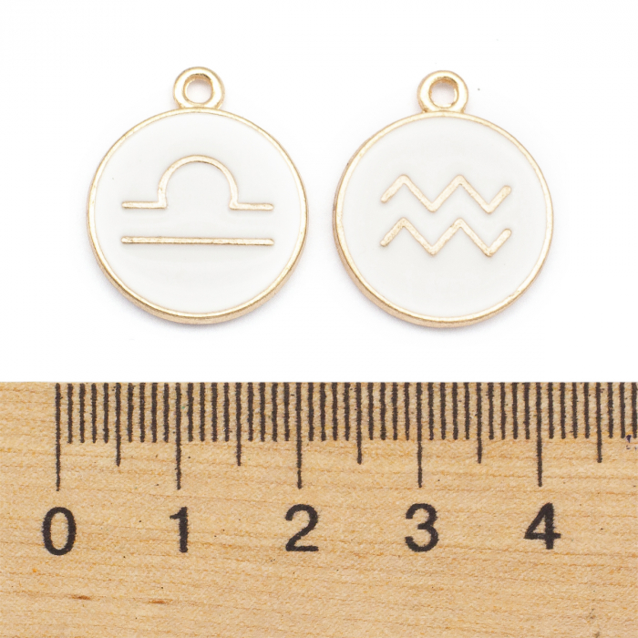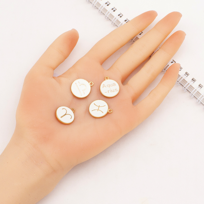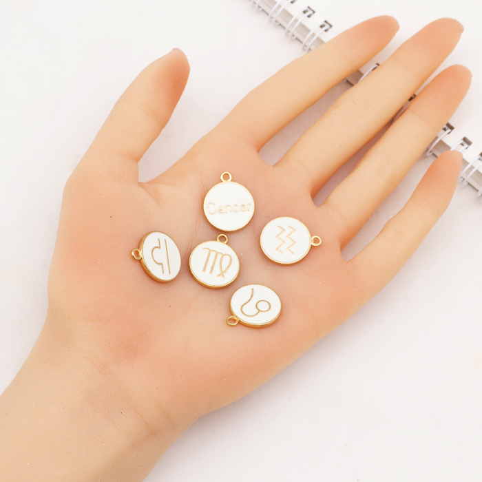 Zestaw zawieszek „Znaki zodiaku” to stylowe i wszechstronne elementy dekoracyjne zaprojektowane do tworzenia unikalnej biżuterii i akcesoriów. Wykonane z wytrzymałego stopu bijouterrenu pokrytego emalią, zawieszki mają płaski, okrągły kształt i wzór odpowiadający symbolom znaków zodiaku. Jasna emalia nadaje im elegancki i nowoczesny wygląd, dzięki czemu idealnie nadają się do spersonalizowanych projektów.