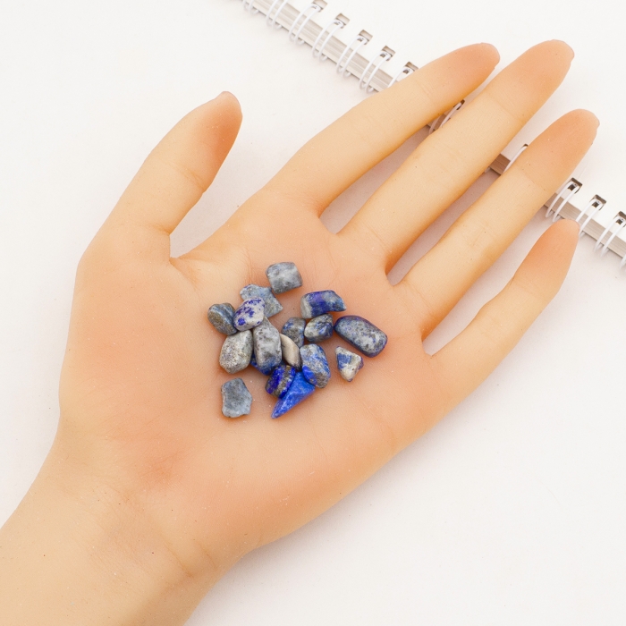 Nieregularne kawałki naturalnego lazurytu o charakterystycznej niebieskiej barwie i naturalnych inkluzjach. Kamień nie był barwiony ani obrabiany, co pozwala zachować jego autentyczną strukturę. Brak otworów sprawia, że idealnie nadaje się do kreatywnych projektów dekoracyjnych oraz pracy z żywicą.