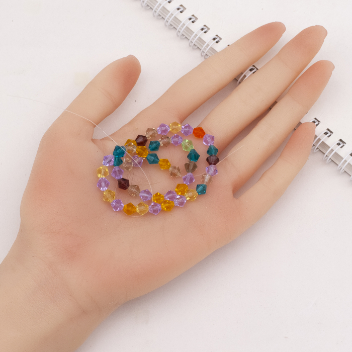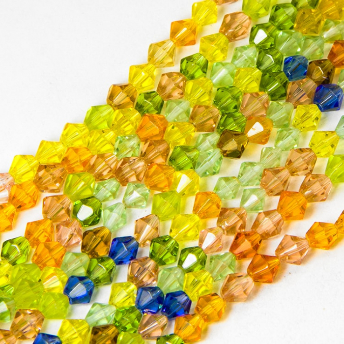 Te fasetowane koraliki w kształcie bikonu z przezroczystego szkła są dostępne w żywej mieszance kolorów. Dzięki swojej fasetowanej strukturze koraliki pięknie załamują światło, co czyni je idealnymi do tworzenia stylowych i kolorowych ozdób.