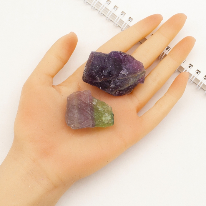 Nieokrawane samorodki z fluorytu zachwycają naturalną strukturą i bogactwem kolorystycznym — od przezroczystości i zieleni po subtelny fiolet. Kamienie nie posiadają otworów i nie były barwione, dzięki czemu w pełni zachowują swoją surową formę i energetykę.