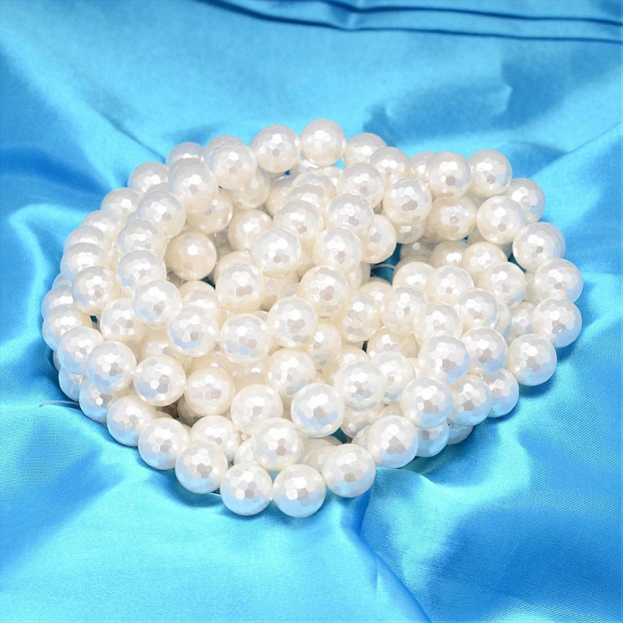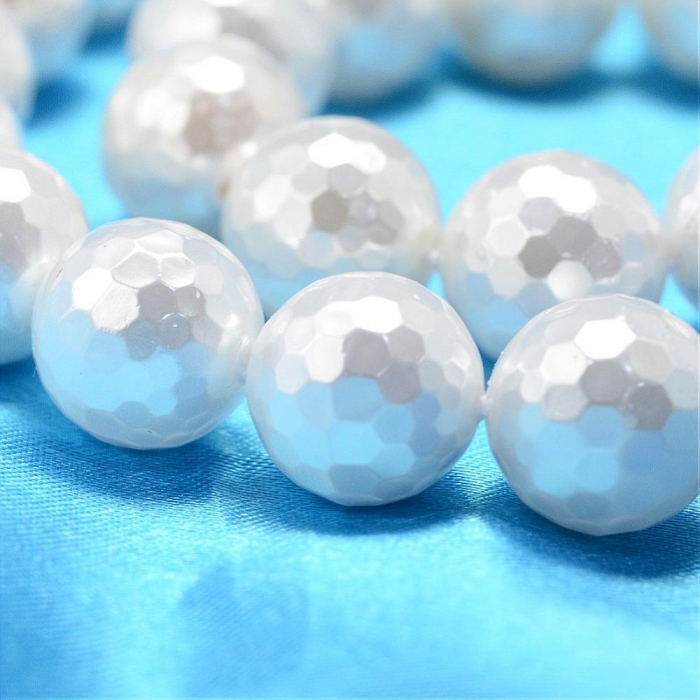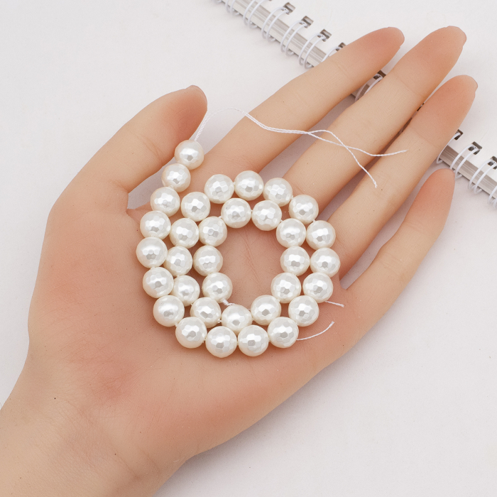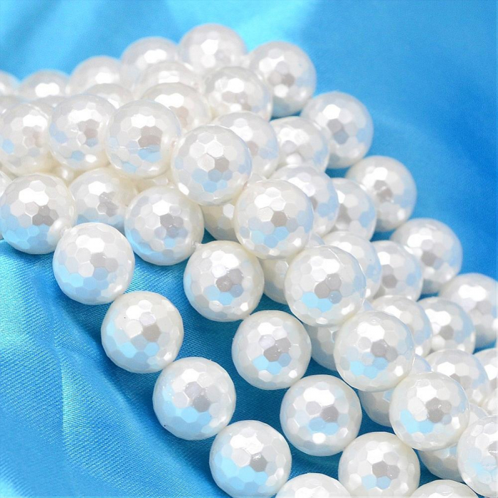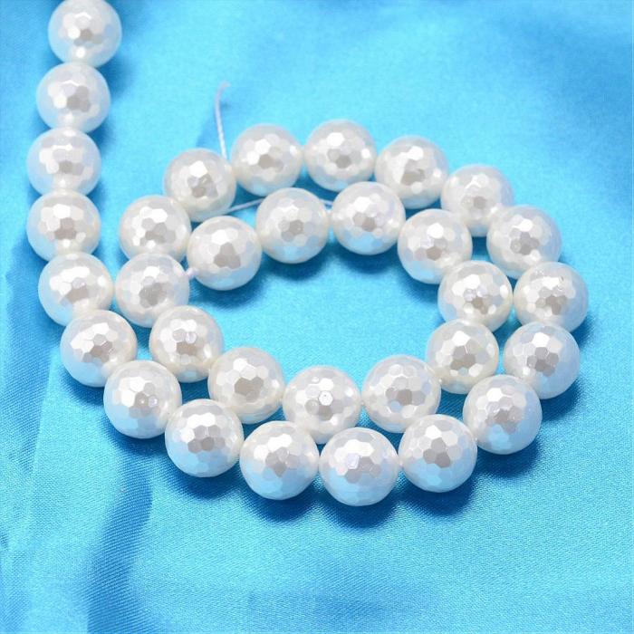 Koraliki Shell Pearl Okrągłe, Fasetowany, Białe, 10mm, otwór 0.8-1mm, około 41szt/40cm/sznur (13WB20810)