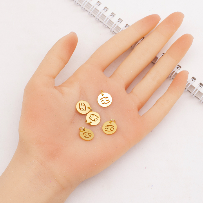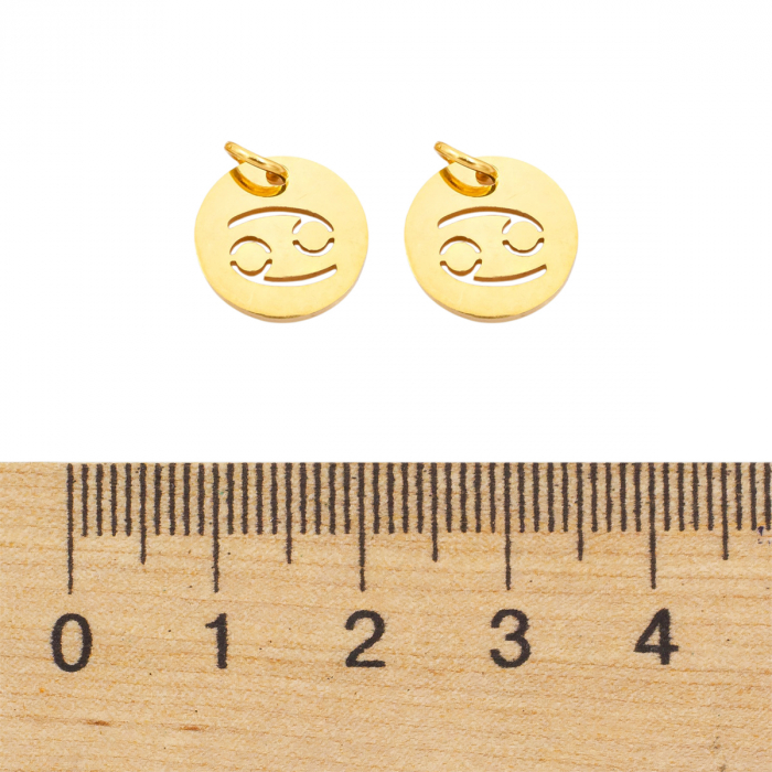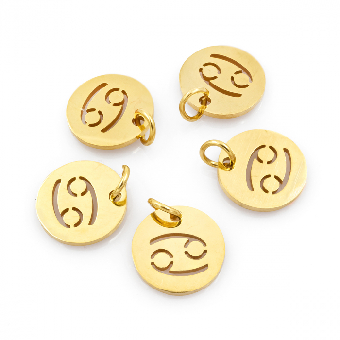 Zawieszka Okrągła Płaska, Stal Nierdzewna, Znak Zodiaku Rak, Złoty, 12x1mm, Otwór: 3mm, 5szt (13WB23769)