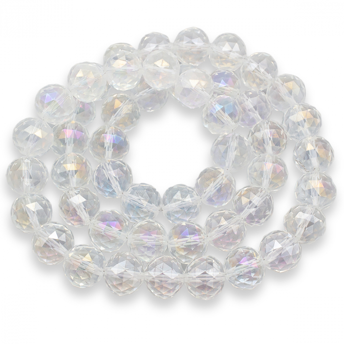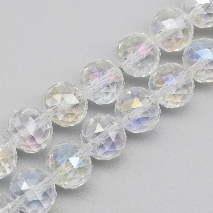 Намистини Скло з Гальванікою, Грановані, Райдужні, Круглі, Колір: Кристал, Розмір: Діаметр 14мм, Отвір 2мм, близько 46шт/68см/нитка, (13WB14716)