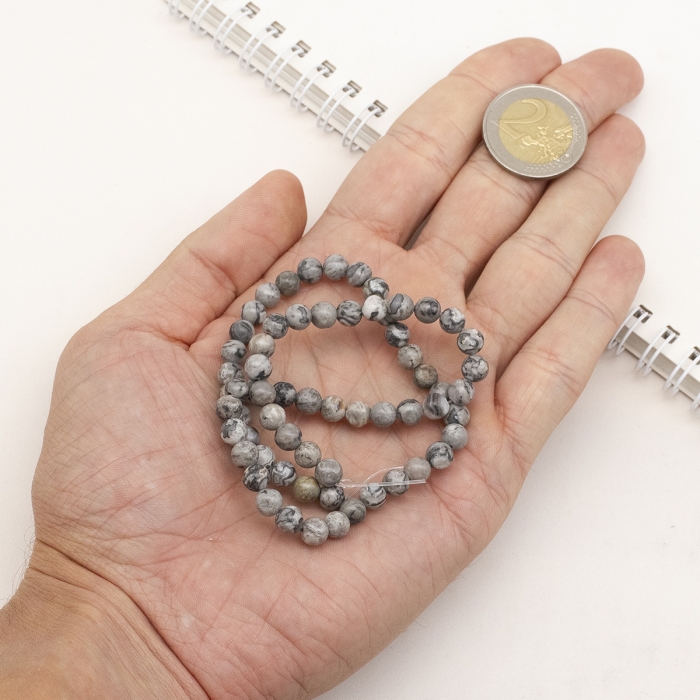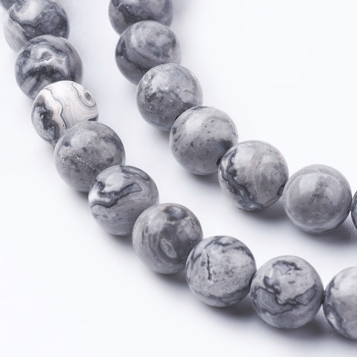 Круглі намистини з натурального каменю Map Stone (відомого також як Picasso Stone або Picasso Jasper), який вирізняється унікальним малюнком з природними вкрапленнями та сіро-коричневими, чорними й землистими відтінками. Цей камінь асоціюється з гармонією, внутрішньою рівновагою та творчою енергією, тому прикраси з ним завжди виглядають оригінально та природньо.