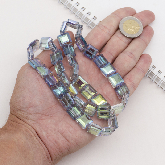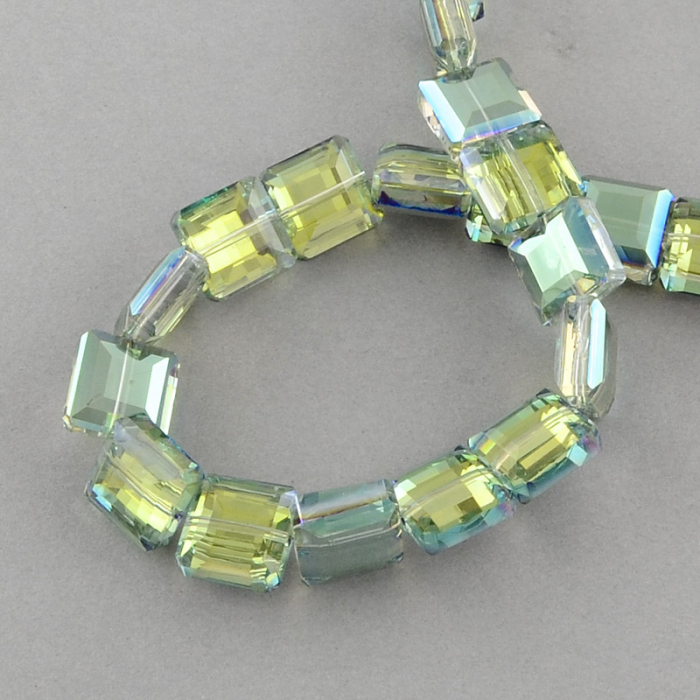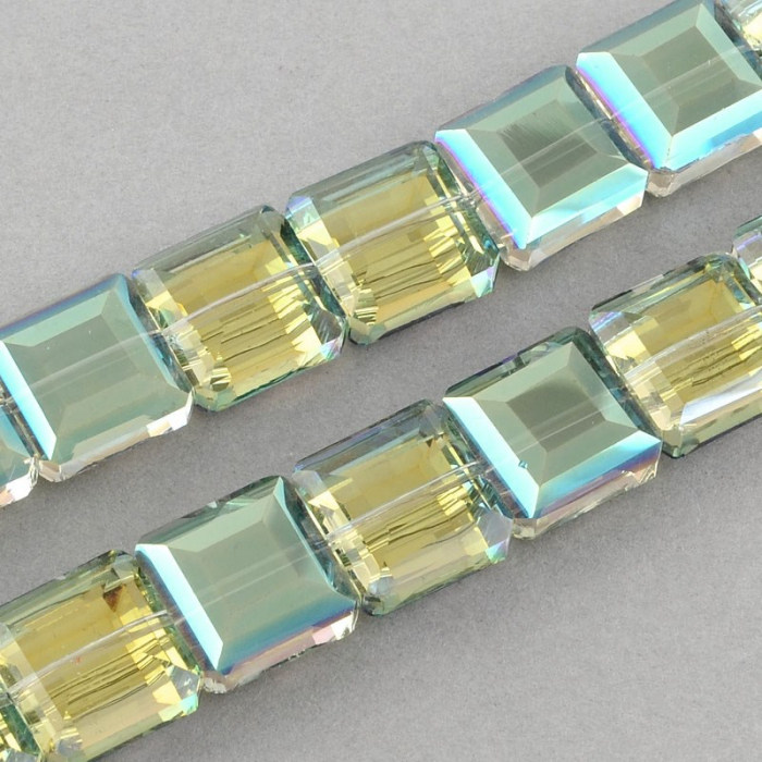 Намистини Гальваніка Скло АВ-Колір, Грановані, Квадрат, Колір: Жовто-зелений, Розмір: 13x13x7.5мм, Отв-тя: 2 мм, близько 40шт / 52см / нитка, (14WB6980)