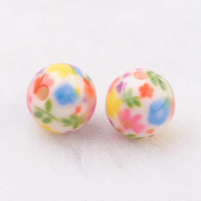Намистини Смола, Круглі, Пофарбовані з Квітковим Візерунком, Колір: Різнобарвний, 10мм, Отвір 2мм, 10шт/упаковка, (13WB29522)
