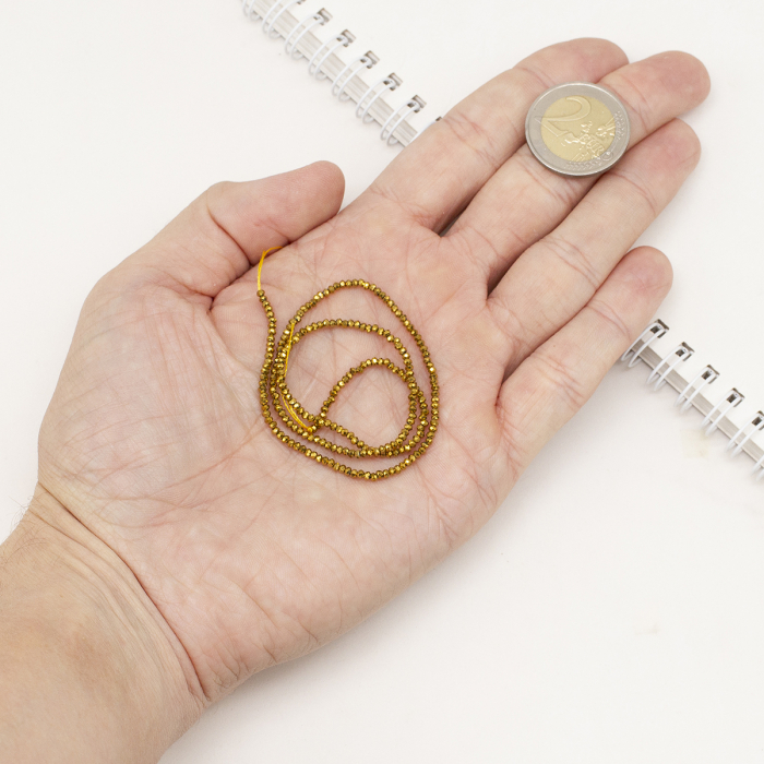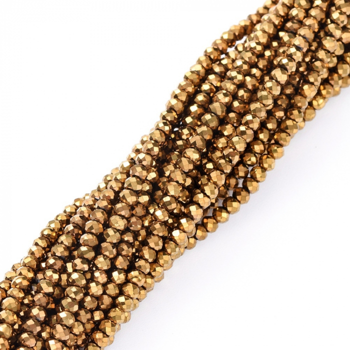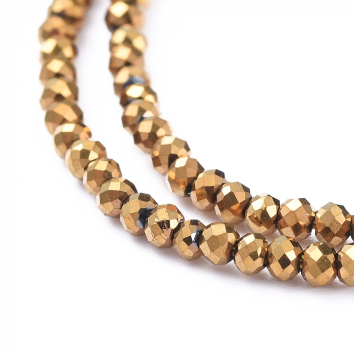 Намистини Гальваніка Скло, Грановані, Рондель, Покриття, Колір: Золото, 2х1.5мм, Отвір 0.6мм, близько 210-218шт/33-34см/нитка, (13WB31219)
