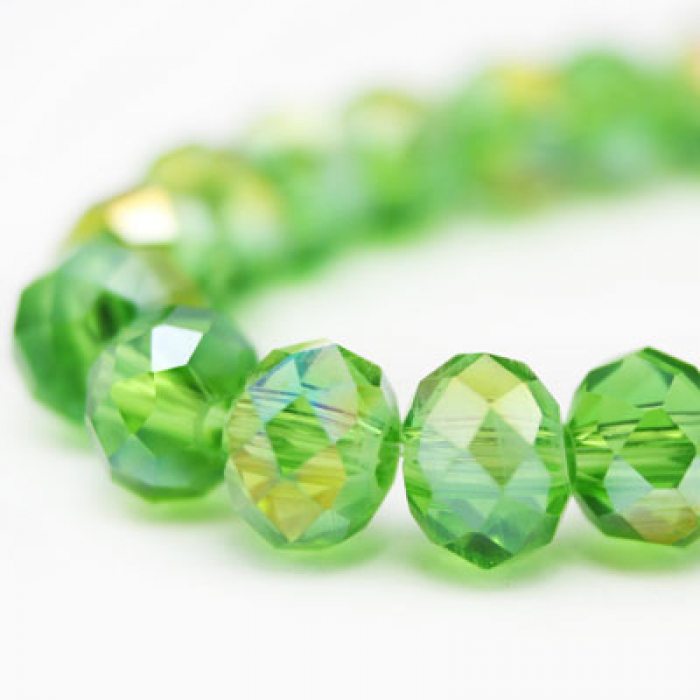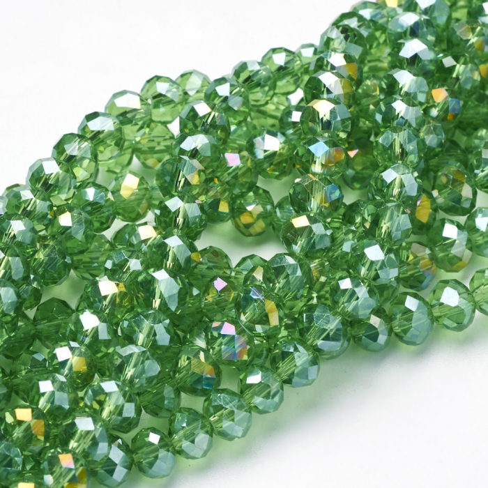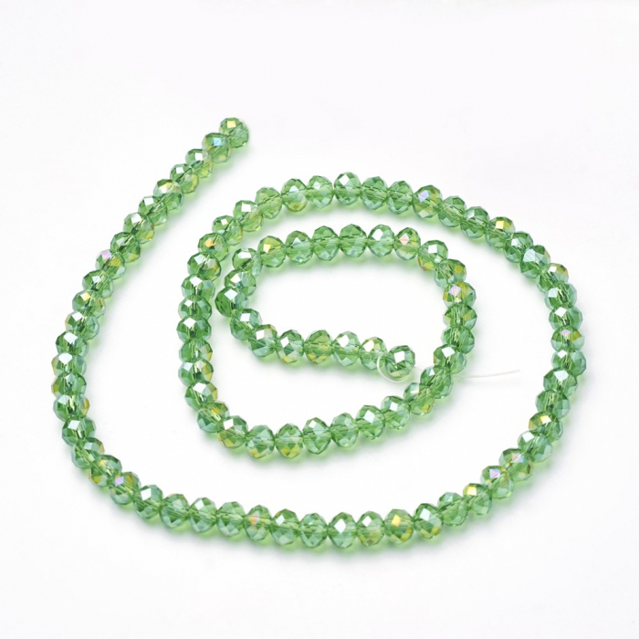 Намистини Гальваніка Скло АВ-Колір, Грановані, Рондель, Колір: Зелений, Розмір: 6х4мм, Отв-тя: 1мм, близько 100шт / 46см / нитка, (5WB7633)