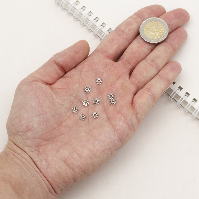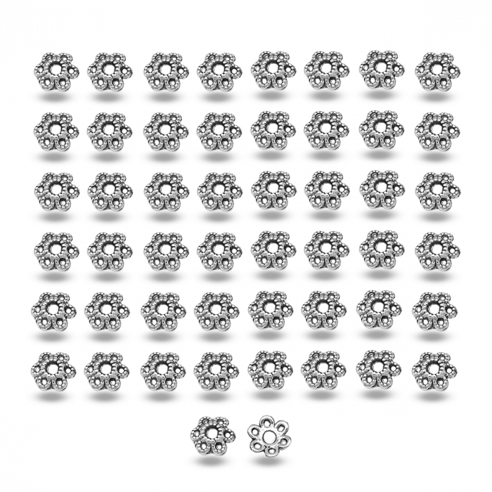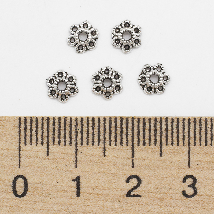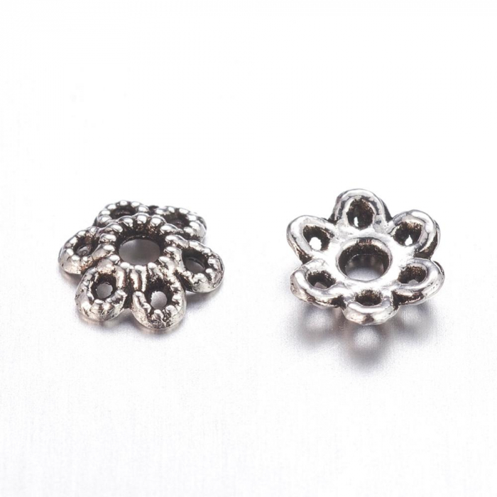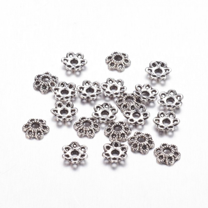 Шапочки для намистин у формі квітки з 6 пелюстками. Виготовлені в стилі Тибету з ажурним дизайном, ці елементи надають елегантності і вишуканості прикрас. Безпечні у використанні – не містять кадмію, нікелю та свинцю.