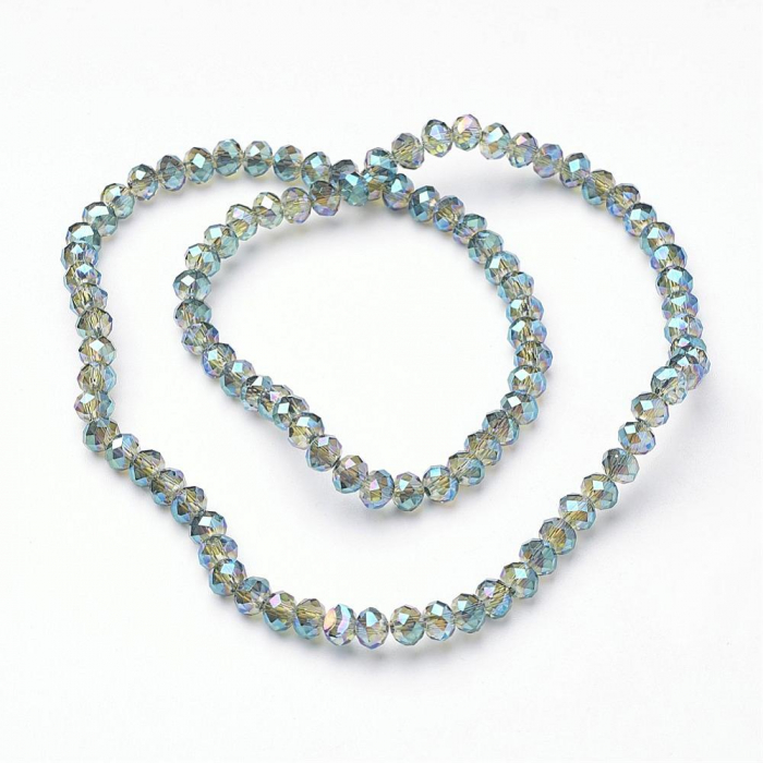 Намистини Гальваніка Скло, Грановані, Рондель, Колір: Бірюзовий, Розмір: 6х4мм, Отвір: 1мм, близько 100шт / 40см / нитка, (13WB19357)