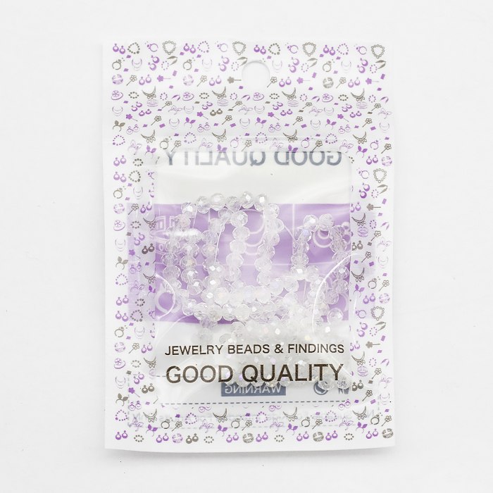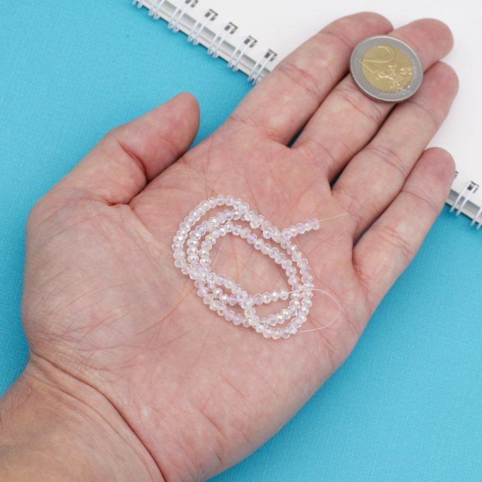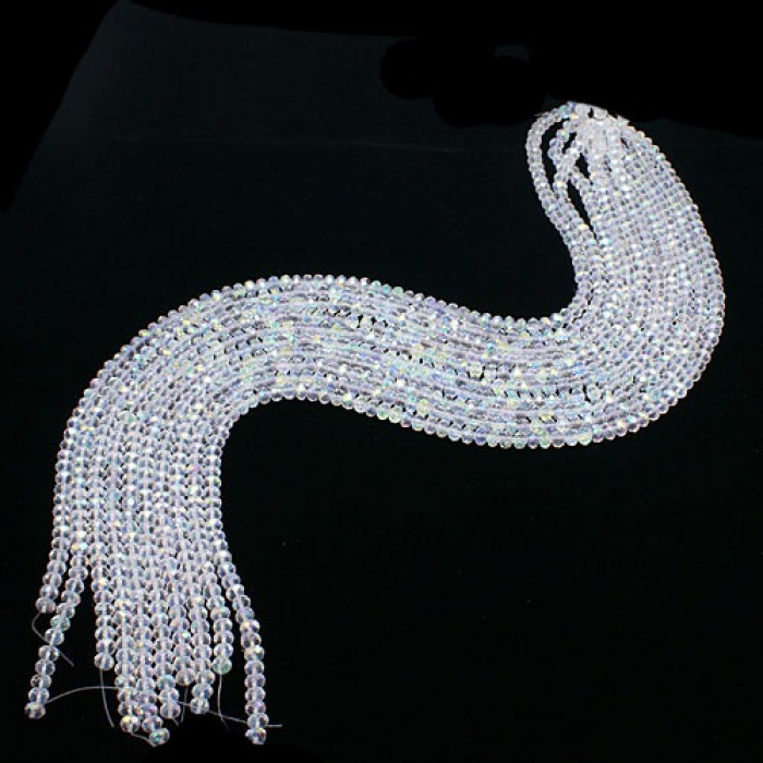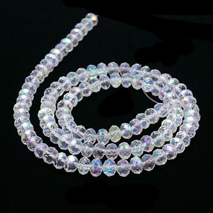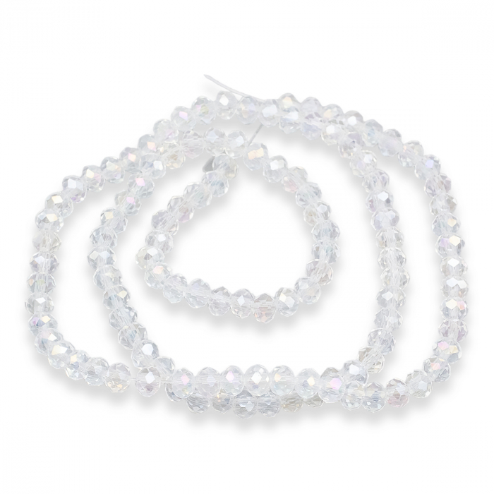 Гранені скляні намистини у формі ронделя з ефектом АВ-колір – це вишуканий матеріал для створення прикрас та декоративних виробів. АВ-ефект (Aurora Borealis або "північне сяйво") надає бісерам райдужний блиск, що переливається, який змінюється в залежності від кута освітлення, додаючи виробам виразності. Прозора основа у поєднанні з ретельно виконаною гранованою поверхнею посилює гру світла, створюючи ефект сяйва та витонченості.